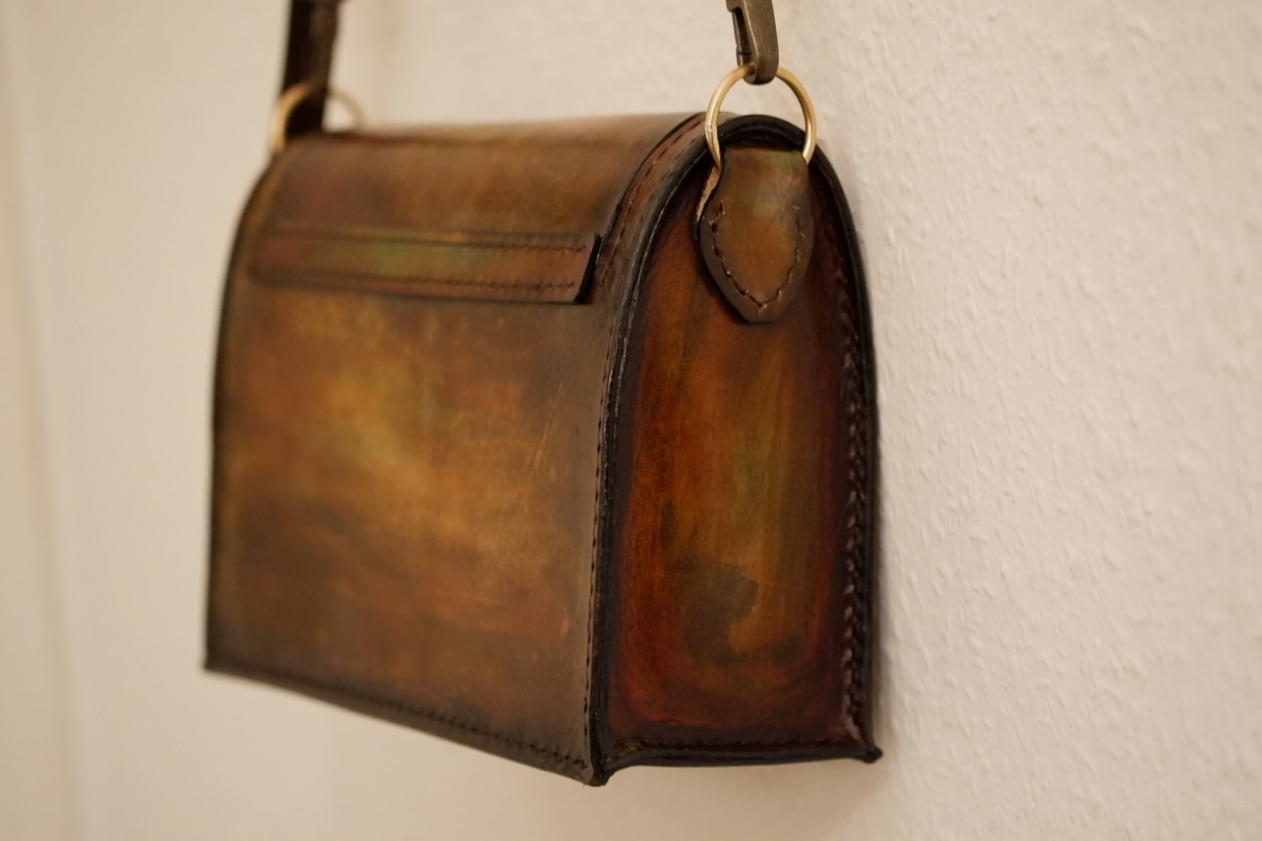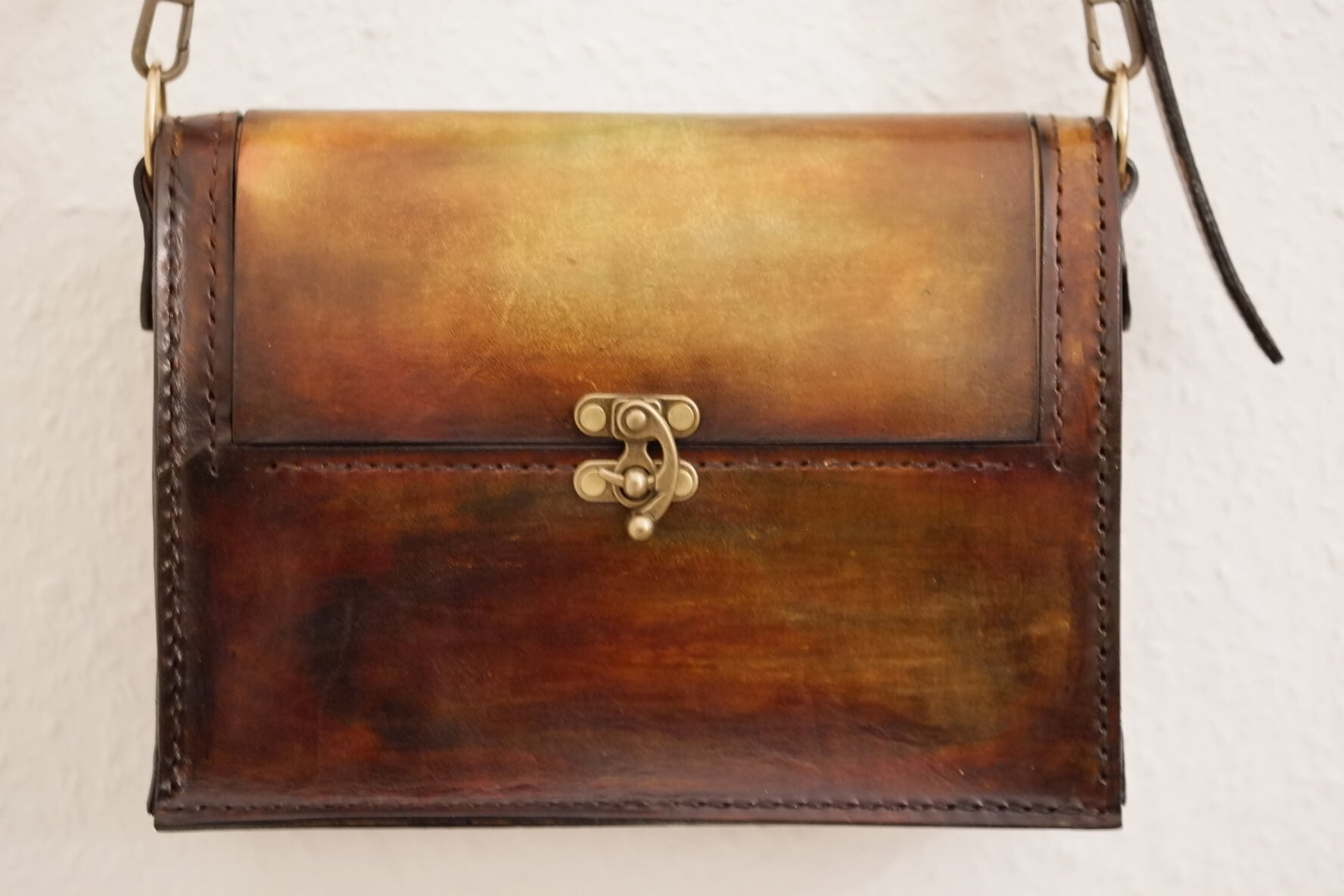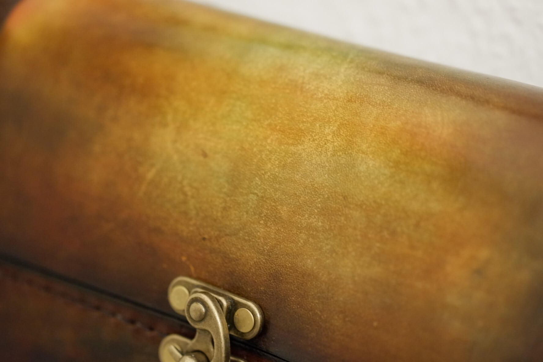 A solid thick leather is dyed in 8 kinds of dye gradation colors to express a deep antique feeling.